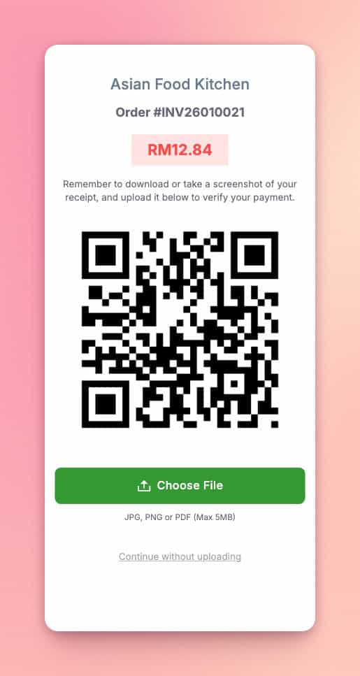 For QR code payments, customers can upload a screenshot or photo of their payment proof on the same payscreen where they see the QR code.